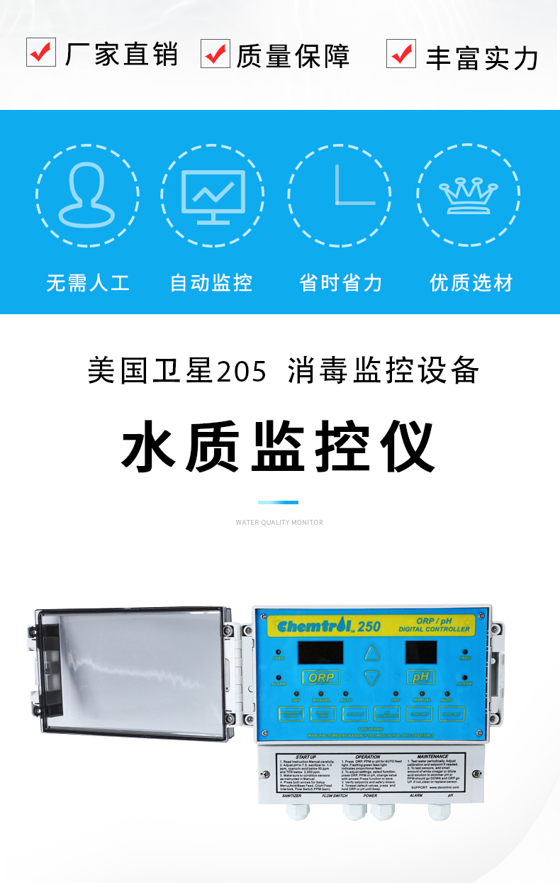 - 人工投藥藥量不穩(wěn)定,含氯/溴不足,細(xì)菌,藻類容易滋生。使用全自動監(jiān)控儀,每天耗電不到1度,無需人工,自動控制水質(zhì),商家游泳池理想匹配產(chǎn)品。