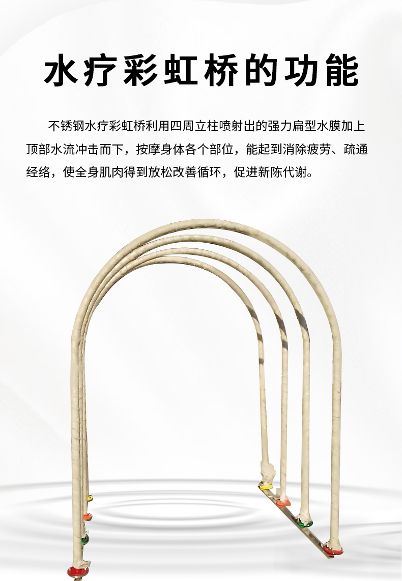 不銹鋼水療彩虹橋利用四周立柱噴射出的強力扁型水膜加上頂部水流沖擊而下,按摩身體各個部位,能起到消除疲勞、疏通經(jīng)絡,使全身肌肉得到放松改善循環(huán),促進新陳代謝。