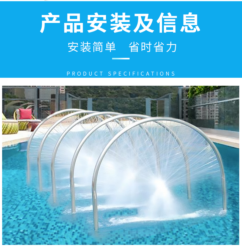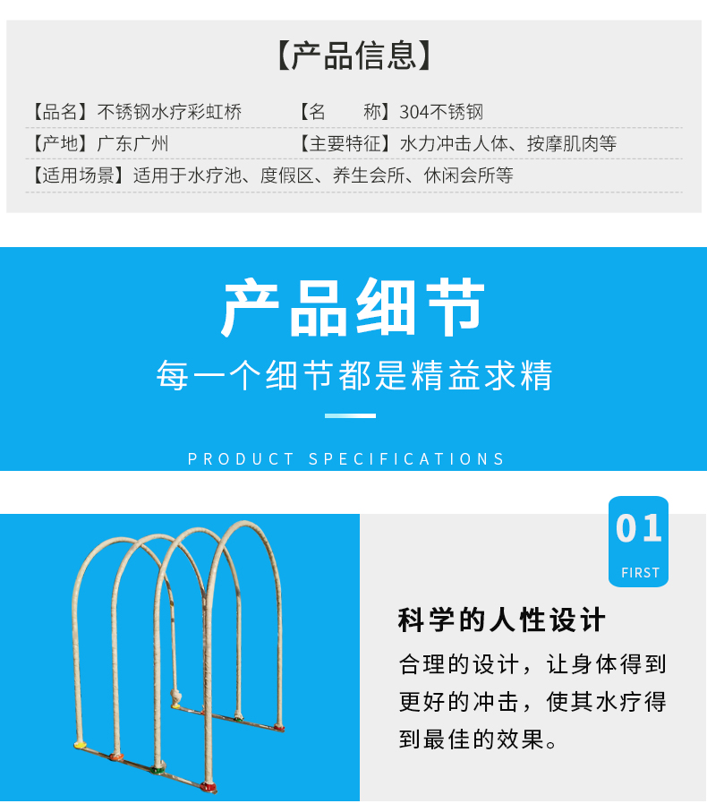 - 不銹鋼水療彩虹橋利用四周立柱噴射出的強力扁型水膜加上頂部水流沖擊而下,按摩身體各個部位,能起到消除疲勞、疏通 經(jīng)絡,使全身肌肉得到放松改善循環(huán),促進新陳代謝。