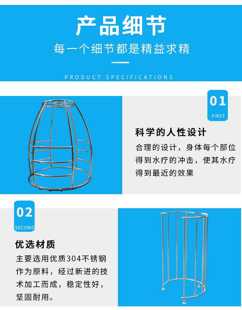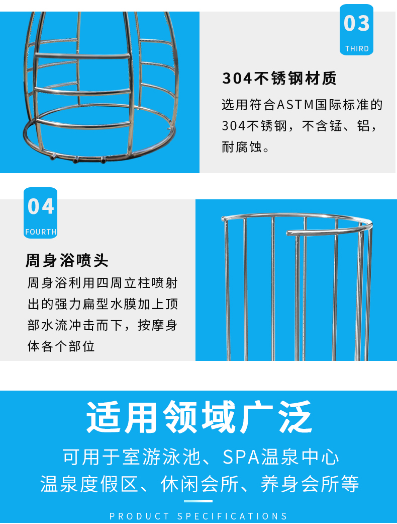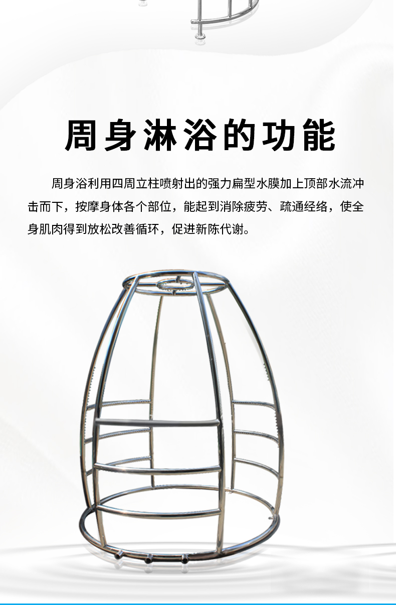 周身浴利用四周立柱噴射出的強力扁型水膜加上頂部水流沖擊而下,按摩身體各個部位,能起到消除疲勞、疏通經絡,使全身肌肉得到放松改善循環,促進新陳代謝。
